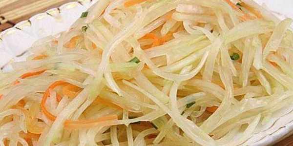 涼拌土豆絲:1、水煮沸後放入土豆絲,直到煮透撈出瀝幹水分;2、再放入清水中冷卻5分鐘撈出;3、將土豆絲盛入大碗中,放上蒜蓉,撒鹽備用;4、平底鍋用加熱,倒入油,油熱後放入花椒、紅辣椒炒香,變成暗褐色後撈出;5、將熱油澆在土豆絲上,拌勻即可。