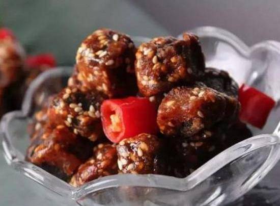 琥珀牛肉:1.把牛腱子肉放白鹵水鍋裡鹵熟,撈出來切成丁後,投入熱油鍋炸至表面酥脆,撈出來瀝油待用。2.鍋裡放少量色拉油燒熱,下白糖炒化後,調入鹽、味精、辣椒粉、花椒粉和醋。3.待糖液濃稠時,放入炸過的牛肉丁粘裹均勻,另外撒上熟芝麻粘勻,等到糖液凝固時,出鍋裝盤並點綴紅椒粒,即成。