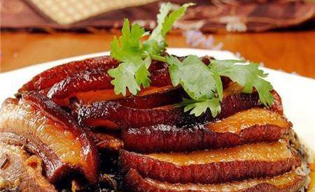梅菜扣肉:豬肉一塊洗凈用鹽酒醃過,放煲裡煮至七成熟,撈起用老抽上色,再用針或錐子在豬皮上均勻地插出小洞,放到油鍋裡將豬皮炸過,盛起後切成片狀,豬皮向下在碗裡排好,梅菜洗凈切碎用水浸透,擰幹水份放鍋裡烘幹後盛起,再起油鑊放蒜頭爆香,放梅菜略炒後放水、糖、鹽煮沸後,再全部放到鋪好豬肉的碗上面,放鍋裡蒸45分鐘至一小時左右,將蒸好的豬肉倒扣在碟上,用原汁勾一個芡淋上面便可!