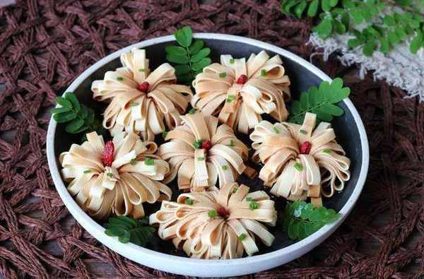 千張豆腐新吃法,不炒不涼拌,無油少鹽,低脂美味,好吃又應景。這道千張豆腐菊花卷還有個大氣的名字叫做富貴花開,意思是用豆腐做成菊花綻開的樣子。中秋傢宴,我傢常做這菜,1塊錢做1盤,5分鐘上桌,好吃又好看。