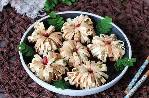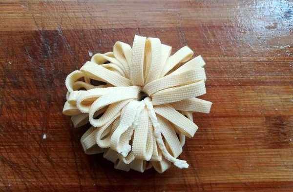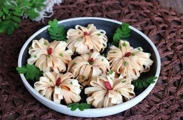 第七步:卷好的豆腐豎起來整理一下,就是一朵好看的菊花瞭。全部做好後擺到盤子裡。