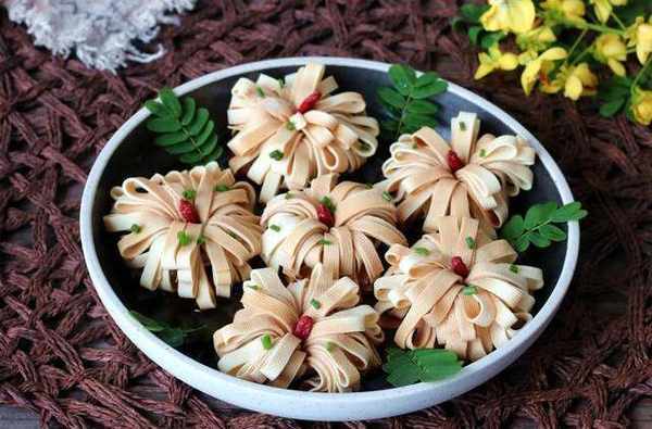 千張豆腐這個做法不用油炒,也不涼拌,從制作到上桌,隻花瞭5分鐘,省事又省力,關鍵食材不貴,做出來比直接涼拌的要大氣得多。今天就給大傢分享一下千張豆腐菊花卷的做法,需要準備的食材有:千張豆腐半斤,枸杞6顆,蔥花適量,生抽2勺,另外準備6根牙簽。
