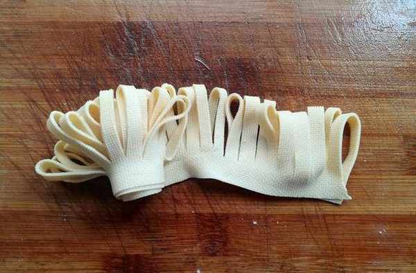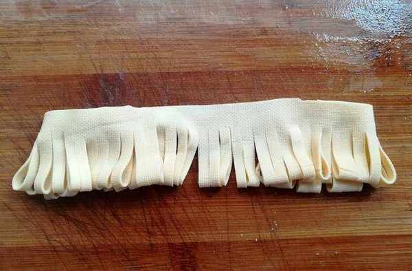 第四步:取一張豆腐,開口向上對折起來,用刀像圖片上那樣切成大約0.5厘米寬的小塊,上面留1厘米左右不要切斷。
