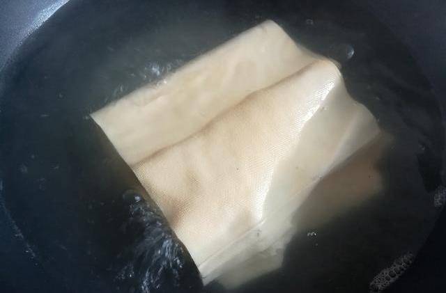 第二步:燒一鍋熱開水,放入千張豆腐焯水1分鐘撈出來。這樣做可以去掉豆腐裡的豆腥味,也可以高溫殺菌。