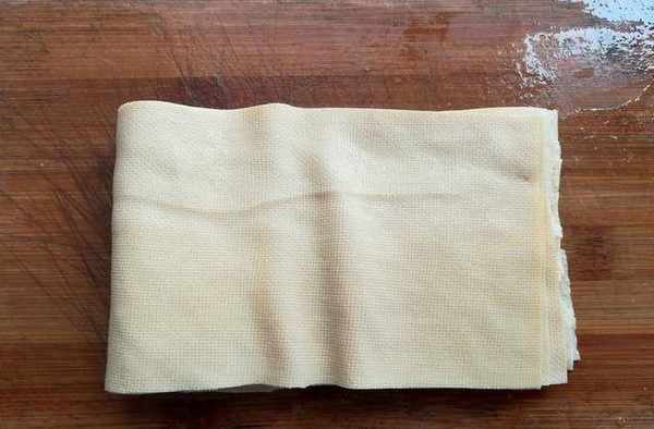 第三步:砧板用開水燙一下,千張豆腐切成合適的寬度,切下來的部分可以用來炒菜。