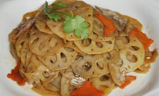傢常藕片:鮮藕切薄片,過一下清水;紅燈籠椒去籽拍碎切丁;青蔥切蔥花。將藕片在沸水中燙1分鐘撈出;過冷水瀝幹。炒鍋置火上,放油熱至7成;下藕片、紅椒丁、鹽、醬油少許翻炒2分鐘;下味精調味即可出鍋裝盤,滴上香油,撒上蔥花即可上桌。