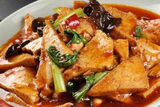 傢常豆腐:豆腐切厚片,用醬油醃制10分鐘,撈出。薑蒜切片,蔥白切段,蔥青切花。約50克植物油燒熱,將豆腐片煎至兩面金黃撈出。餘油炒香薑蒜片、蔥段,將醃制豆腐後的醬油烹入,放入豆腐。翻炒幾下後加點開水,放少許白糖,少許鹽,慢火收幹汁。盛盤後撒上蔥花等。