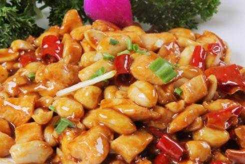 宮保雞丁:雞胸肉切1cm大小的丁,加入鹽(1/2茶匙),料酒和淀粉攪拌均勻後,醃制5分鐘。蒜切小粒,蔥薑切末。青紅椒切粒。將蒜蔥薑放入碗中,調入鹽(半匙),白糖,米醋,醬油,清水,水淀粉調成汁備用。鍋燒熱,倒入油,再添加少許香油,趁油冷時放入花椒,待花椒出香味,顏色略變深後,放入幹辣椒爆香。放入雞丁炒至變色後,將青紅椒粒放入,翻炒10秒鐘,倒入調好的料汁,大火翻炒1分鐘後,倒入炸好的花生米即可。