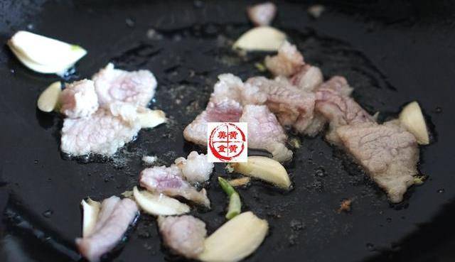 鍋裡加入少許的油,熱鍋涼油,放入肉片翻炒,加入蒜片爆香。