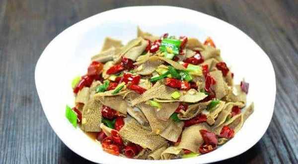 3,小炒毛肚。做法:毛肚,杏鮑菇,幹辣椒,花椒,薑,蠔油,生抽,蒜米,雞精。做法:把毛肚洗凈切成塊,杏鮑菇切成菱形片,薑切成薑末,蒜米切蒜蓉,鍋裡放入油,把毛肚和杏鮑菇過油至熟撈出瀝油。鍋裡留油放入幹辣椒、花椒、薑末蒜蓉炒出香味,就下剛才滑過油的毛肚塊和杏鮑菇,調味放蠔油、生抽,雞精,鹽翻炒均勻就可以出鍋瞭。