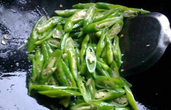 4、然後把辣椒跟黃瓜放進去翻炒,炒上幾分鐘之後加一些料酒食鹽調味,最後放上韭菜就可以出鍋瞭。