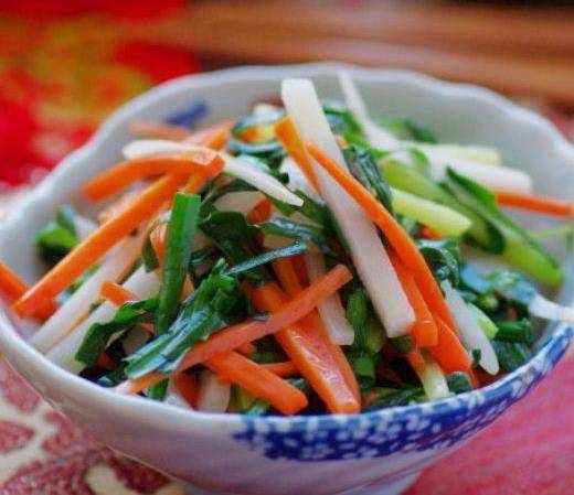 炒春盤:韭菜、芹菜切段、胡蘿卜去皮擦絲、筍切絲,小鍋燒水,水開後放入筍絲焯燙1分鐘,撈出瀝幹,另起鍋,加少許油,油燒熱後放入胡蘿卜絲,再放入芹菜段,煸炒至胡蘿卜變軟,放入韭菜,放入焯燙好的筍絲,翻炒1分鐘左右,加入糖、鹽和味精,翻炒均勻即可,隻有吃過才知道他的美味。