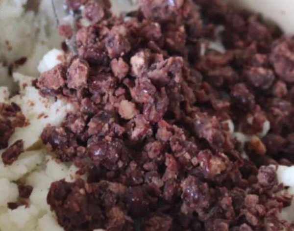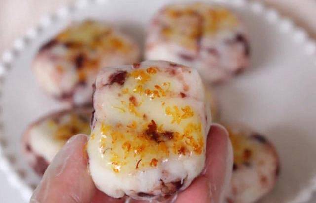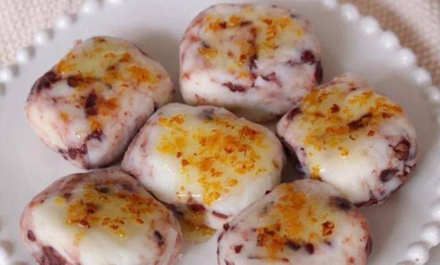 第五步:山藥泥中加入煮好的紅豆,兩者拌勻,兩者充分混合均勻以後整理成方形,最後滴上糖桂花,美味的無油無糖的低脂桂花山藥紅糕就完成啦!