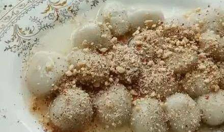 接著把鍋中剛才炒好的糖水澆淋在糯米圓團上,最後把剛開始準備好的的花生碎撒在糯米圓子上,我們美味的糯米粉小點心就做好瞭!趕快來品嘗!