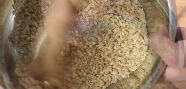 現在鍋裡倒入100克的花生,不用放油小火慢炒,多次翻炒它,全程大概6分鐘左右朝著外皮變色發黃就可以出鍋瞭。晾至常溫後,用手把花生皮搓掉,然後用搟面杖把花生搗碎,不用倒得太碎,看著是顆粒狀就可以瞭。