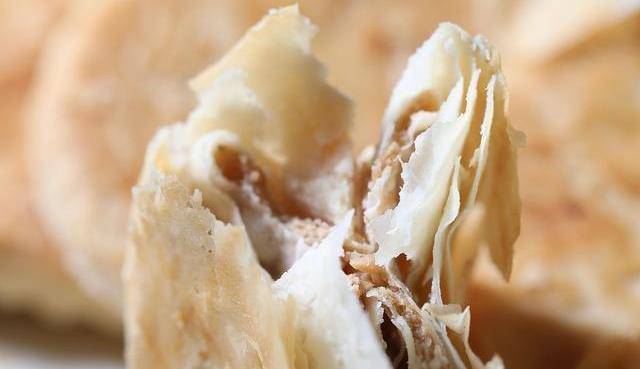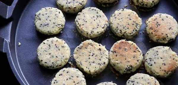開中小火大概烙三分鐘左右。然後底面微黃,給它翻個面。大概到三分鐘左右,烙至另一面發黃,再次翻面,反復翻面烙至兩面金黃出鍋,如果這裡感覺粘鍋不太好的話,可以在下面墊層油脂,我們的花生酥餅就做好瞭,外形細膩而且均勻,用手輕輕一掰就碎瞭。