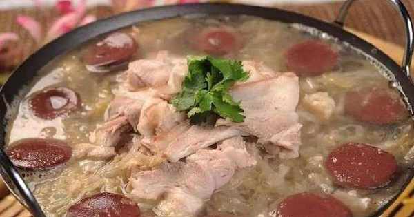 這是朋友做的東北人愛吃的飯菜,酸菜燉血腸,裡面配的還有白花花的五花肉,我看著就覺得沒有食欲!血腸是東北殺豬菜中經典的一道。是用新鮮的豬血灌在豬腸裡煮熟制成。一般會和酸菜一起燉,或者是直接蘸醬油吃。外表的豬腸口感勁道,裡面的豬血味道又很嫩。不是說不好吃是真的吃不慣!哈哈哈!