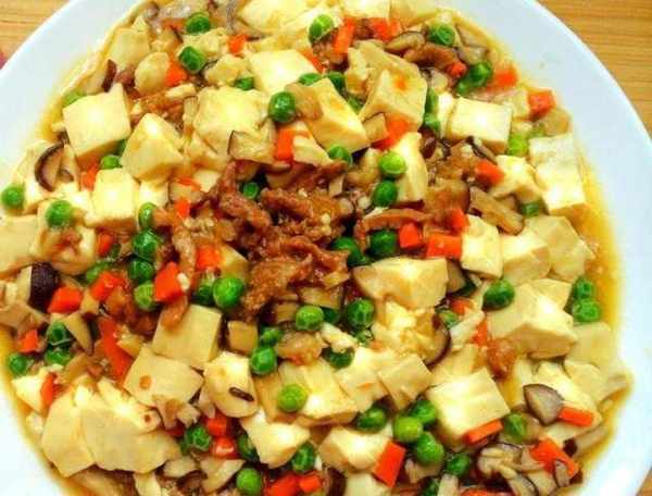 豆腐,豌豆,胡蘿卜丁,香菇