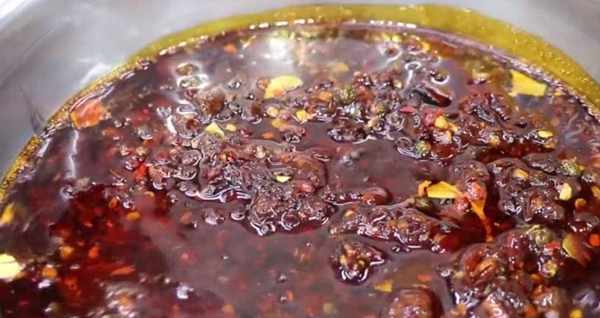 5、牛油煉化後就將剛才的小料蔥結、香菜、薑片、洋蔥絲加進去,用小火煸炒炸幹後,用漏勺將這些雜交的食材撈出不要。撈出之後,就下入我們鍘碎的辣椒,用鏟子將下入的一團辣椒攪散,然後往裡面下入豆瓣醬,這個時候就用中小火慢慢地炒,把辣椒和豆瓣慢慢炒香。