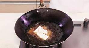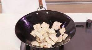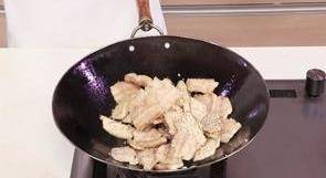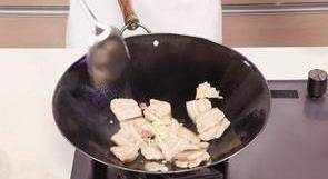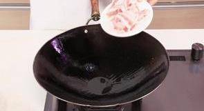 5 5.鍋留底油,放入五花肉,炒至變色。