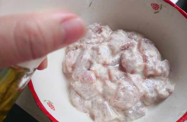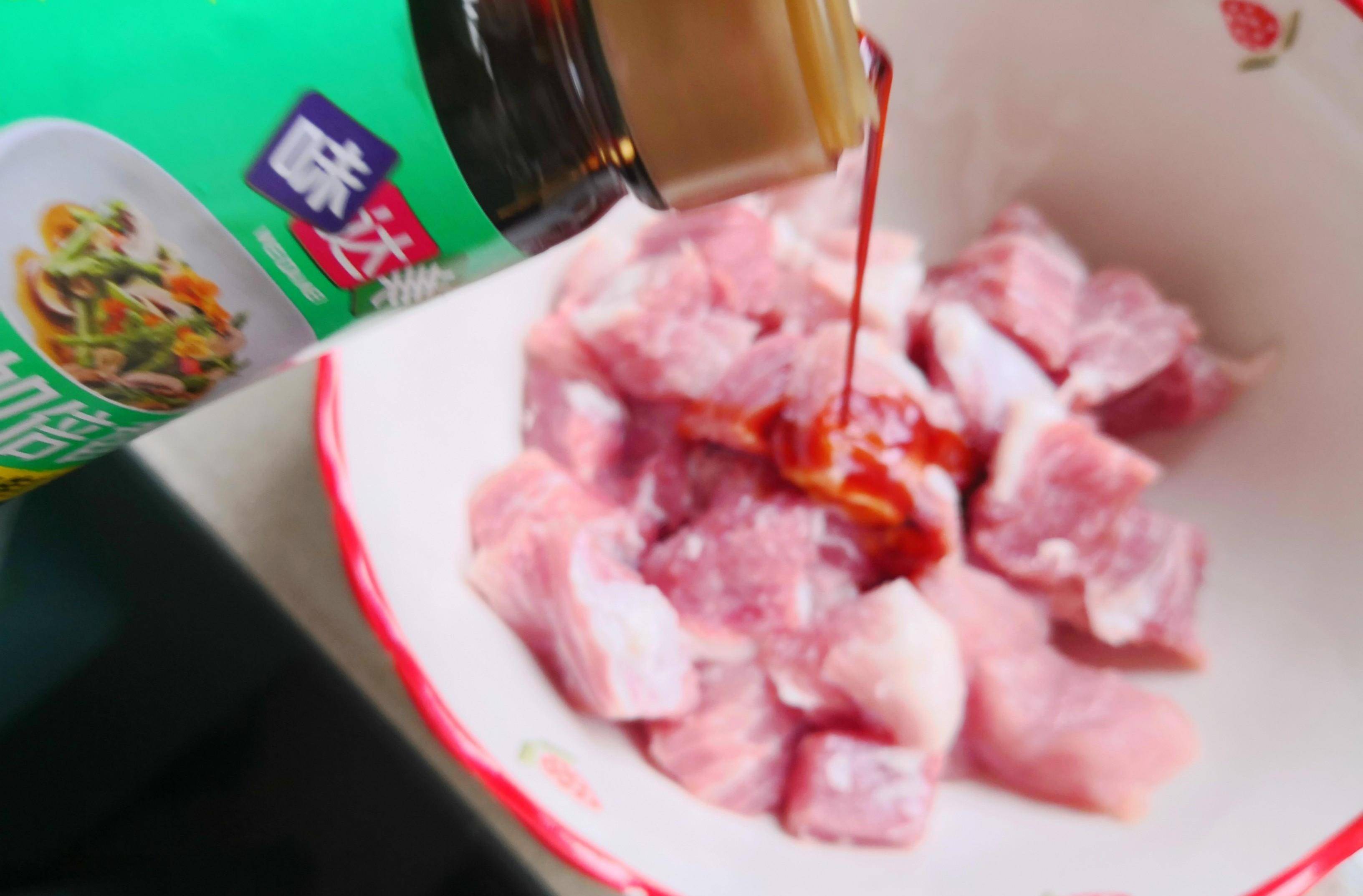 3.豬裡脊切塊,加生抽抓勻,
