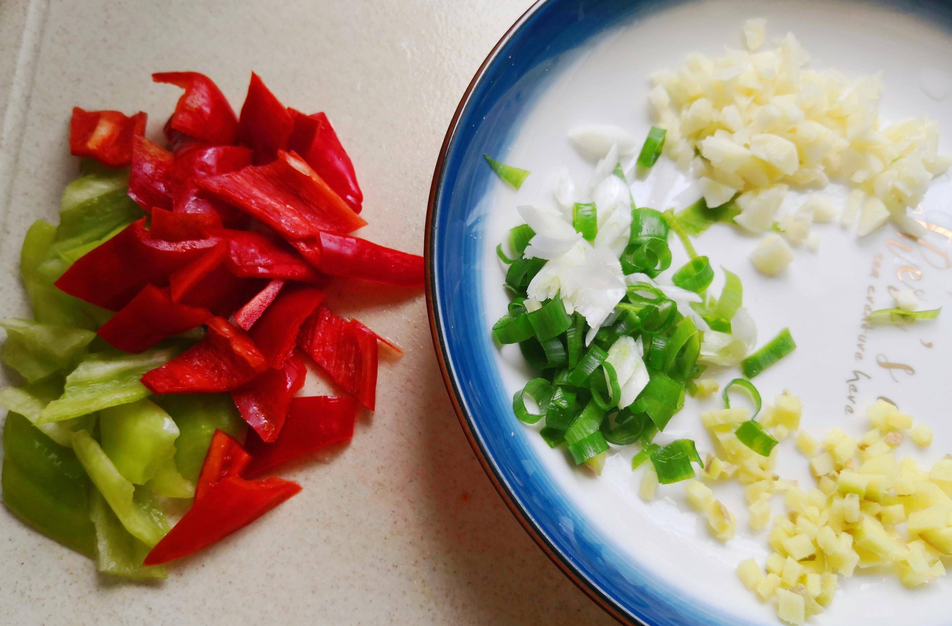 2.青紅椒切塊,蔥薑蒜切碎備好,