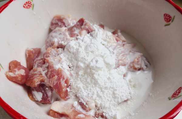 4.2勺淀粉加水攪拌均勻制成水淀粉,加入到豬肉裡,再加適量幹淀粉,抓拌均勻,
