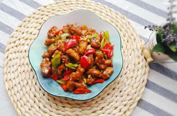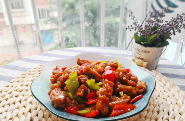 食材:豬裡脊300克,青紅椒各1個,生抽1勺,醬油1/2勺,米醋1/2勺,老抽1小勺,蠔油適量,油適量,蔥薑蒜適量,淀粉適量