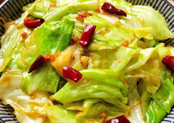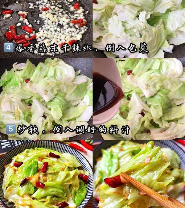 3、鍋入油,爆香蒜末幹辣椒,倒入包菜炒軟,淋入調好的汁,翻炒均勻出鍋。