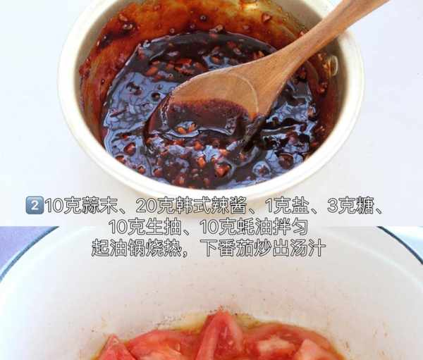 2、10克蒜末、20克韓式辣醬、1克鹽、3克糖、10克生抽、10克蠔油拌勻。起油鍋燒熱,下番茄炒出湯汁。