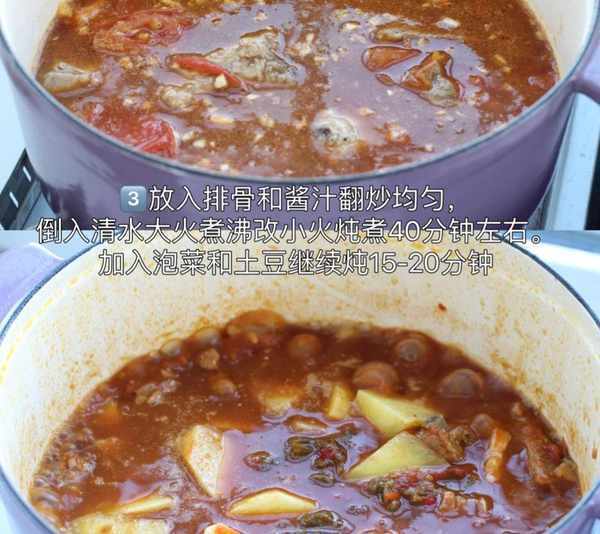 食材:番茄2個、泡菜100克、土豆1個、排骨400克、清水;