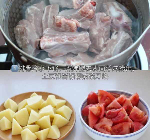 1、排骨冷水下鍋,煮沸撇去表面浮沫撈出,土豆和番茄切成滾刀塊。