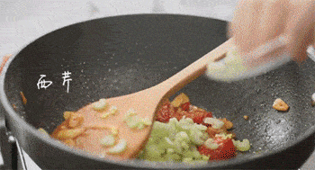5、熱鍋起油,倒入薑蒜、檸檬和西紅柿炒香。