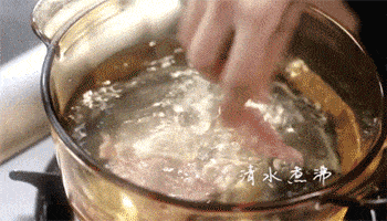 9、取一鍋清水煮沸,下入肉片,煮熟,撈起。