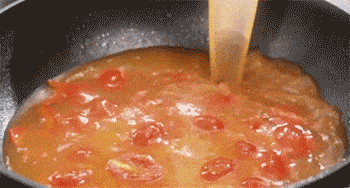 10、熱鍋起油,倒入聖女果和彩椒翻炒,倒入煮好的湯汁,燒開後倒入肉片放適量鹽攪拌均勻。