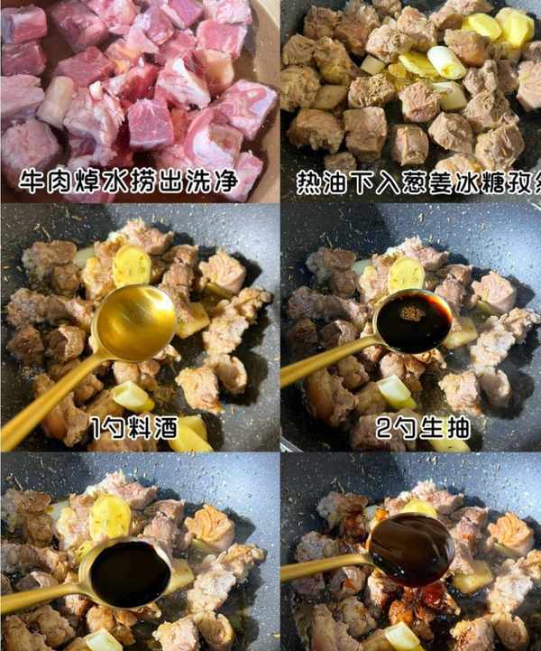 1、牛肉冷水下鍋煮出血沫,撈出清洗幹凈,鍋裡熱油下入蔥薑 冰糖 孜然和牛肉翻炒2分鐘,然後加1勺料酒 2勺生抽 1勺蠔油 1勺老抽翻炒均勻後倒入熱水沒過牛肉;