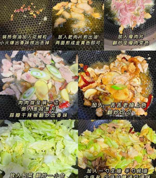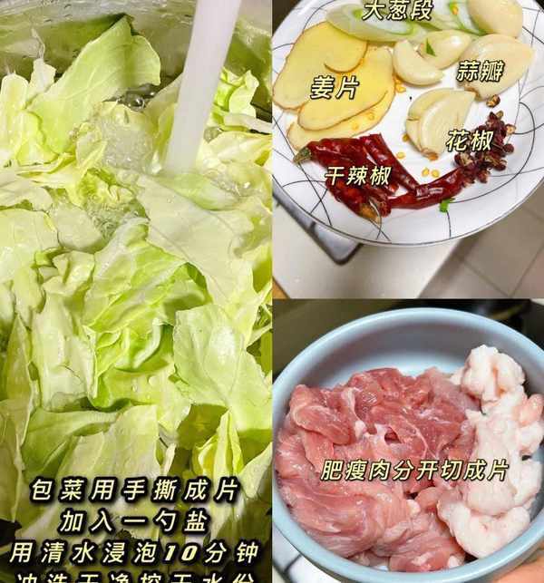 食材:包菜、五花肉、蔥薑蒜、幹辣椒、花椒粒;