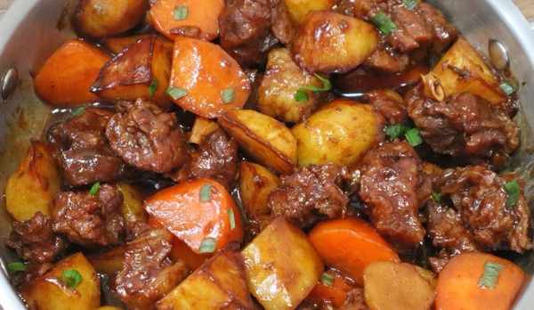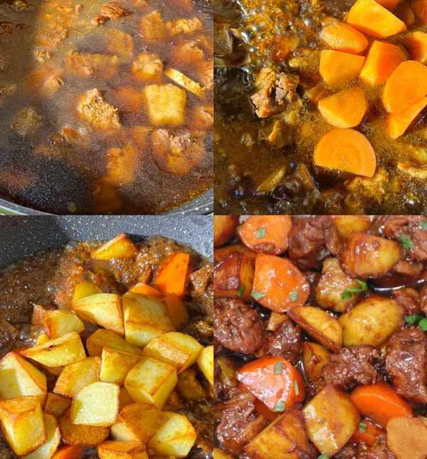 4、牛肉轉到鍋裡,加入胡蘿卜,收汁到一半的時候下入土豆,收到湯汁濃稠就好啦;
