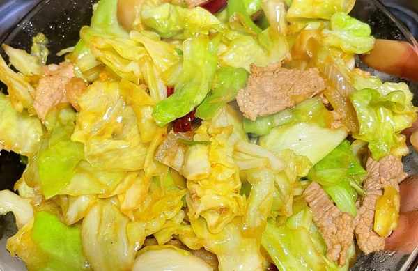 4、加入一丟丟老抽翻炒均勻上色,加入包菜,翻炒一會,炒至包菜變軟,加入一勺生抽,半勺蠔油,少許鹽,少許白糖進行調味,快速翻炒均勻,嘗一下咸淡就可以出鍋啦。