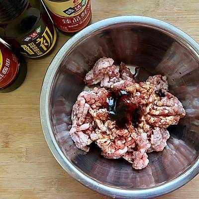 2.在豬肉餡中加入3勺威達美味鮮醬油、2勺威達鮮美蠔油、1勺威達味美原醬油和適量食用油。向一個方向攪拌,在此過程中加入適量的水。