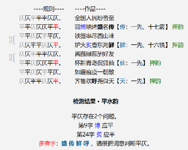 第四句“爐火炙香東海鮮”,第三字“炙”為仄聲,出律,但第五字用平聲“東”,予以“拗救”,避免瞭全句“犯孤平”。此為七言律詩常見的拗救格式。