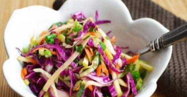 材料:紫甘藍、生菜、蘋果、胡蘿卜、大蔥、香菜葉、沙拉油、蜂蜜、蘋果醋、青檸汁、鹽、胡椒粉、辣椒粉