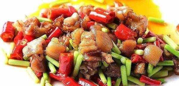 2、鍋留底油,投入薑片和蒜片爆香,下入豬腳丁、美人椒節、蒜薹節,邊炒邊調入鹽、味精、雞精、醋,炒勻後淋些花椒油,出鍋裝盤即成。