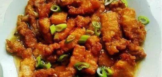 2、把切好的碎肉,放入面糊中,醃制10分鐘。油中火燒熱,把拌上面糊的碎肉炸至7分熟。