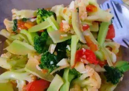食材:菜花200克,西藍花150克,番茄1個,鹽、蒜、蔥、薑、雞精、色拉油各適量。