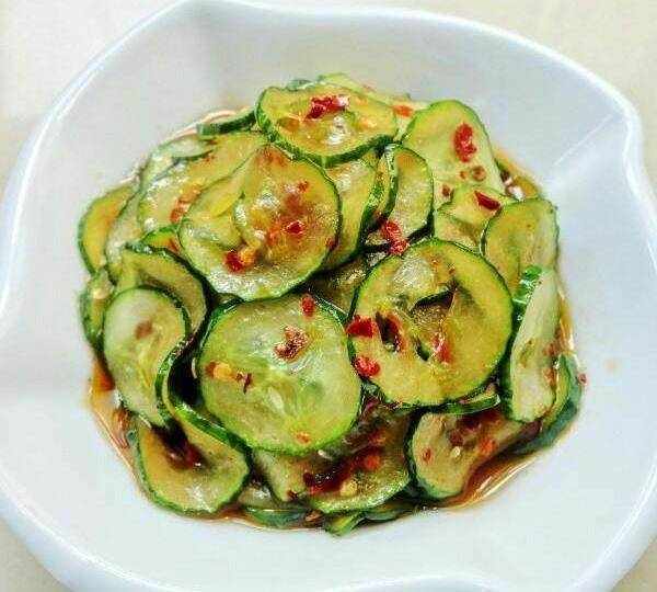 1.黃瓜切片;提前2個小時,在黃瓜片上撒鹽和糖醃制;