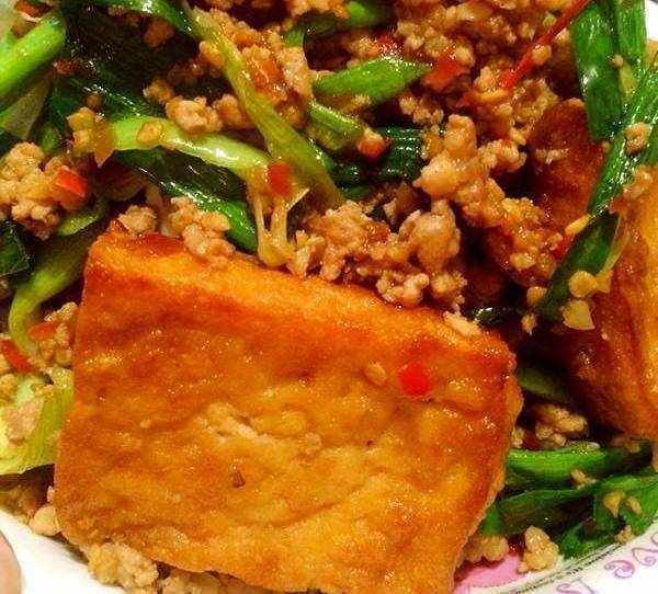 1.韭菜切小段,大蒜切碎備用。肉末用少許料酒和醬油和油醃制5分鐘。豆腐切塊入鍋雙面煎金黃出鍋備用。註意煎的時候要一面完全煎好再翻面,不然容易粘鍋。