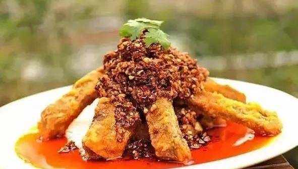4、往凈鍋裡倒入色拉油燒熱,先下蒜泥和辣椒炒香,隨後加入鹽、味精和雞精,淋入香油炒勻,澆在盤中的排骨上面即可。