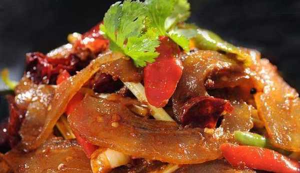 5、起油鍋煸香蒜末和幹紅辣椒碎,倒入牛筋翻炒;