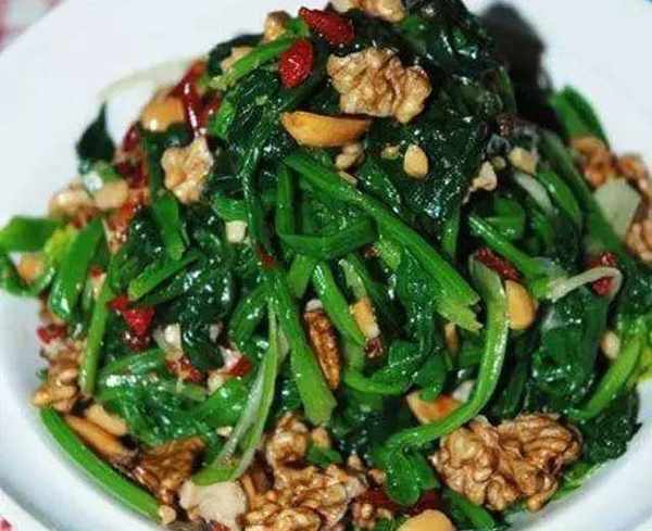 材料:菠菜300g、核桃仁50g、麻辣花生碎50g、枸杞5g、香油適量、鹽適量、生抽適量
